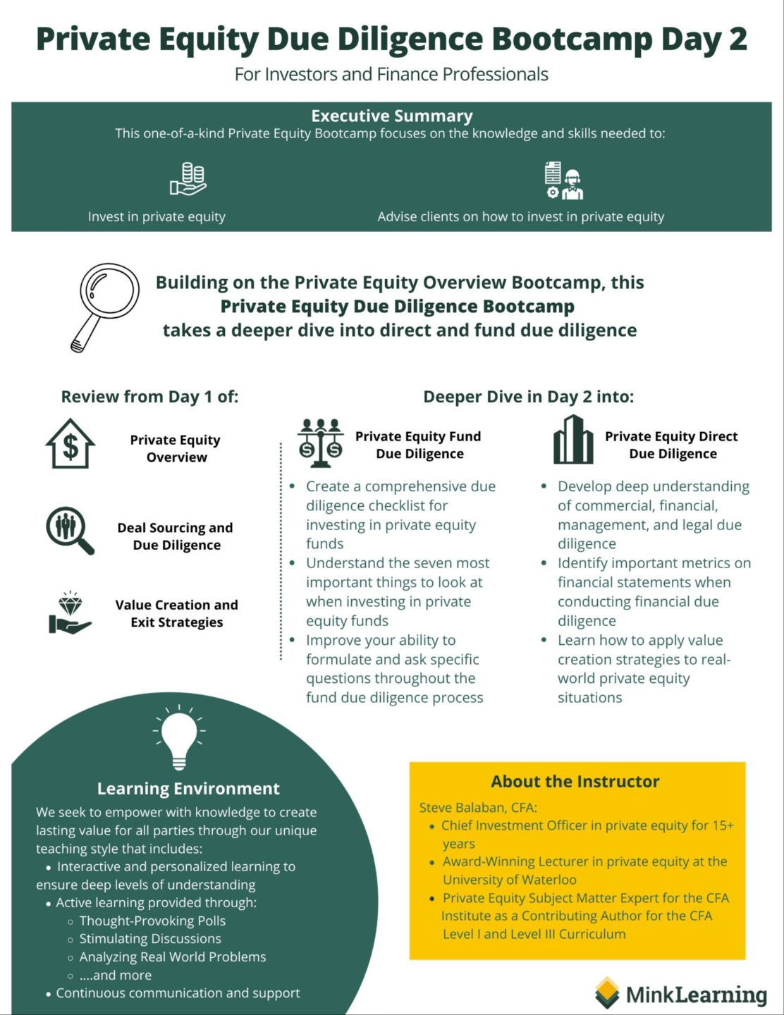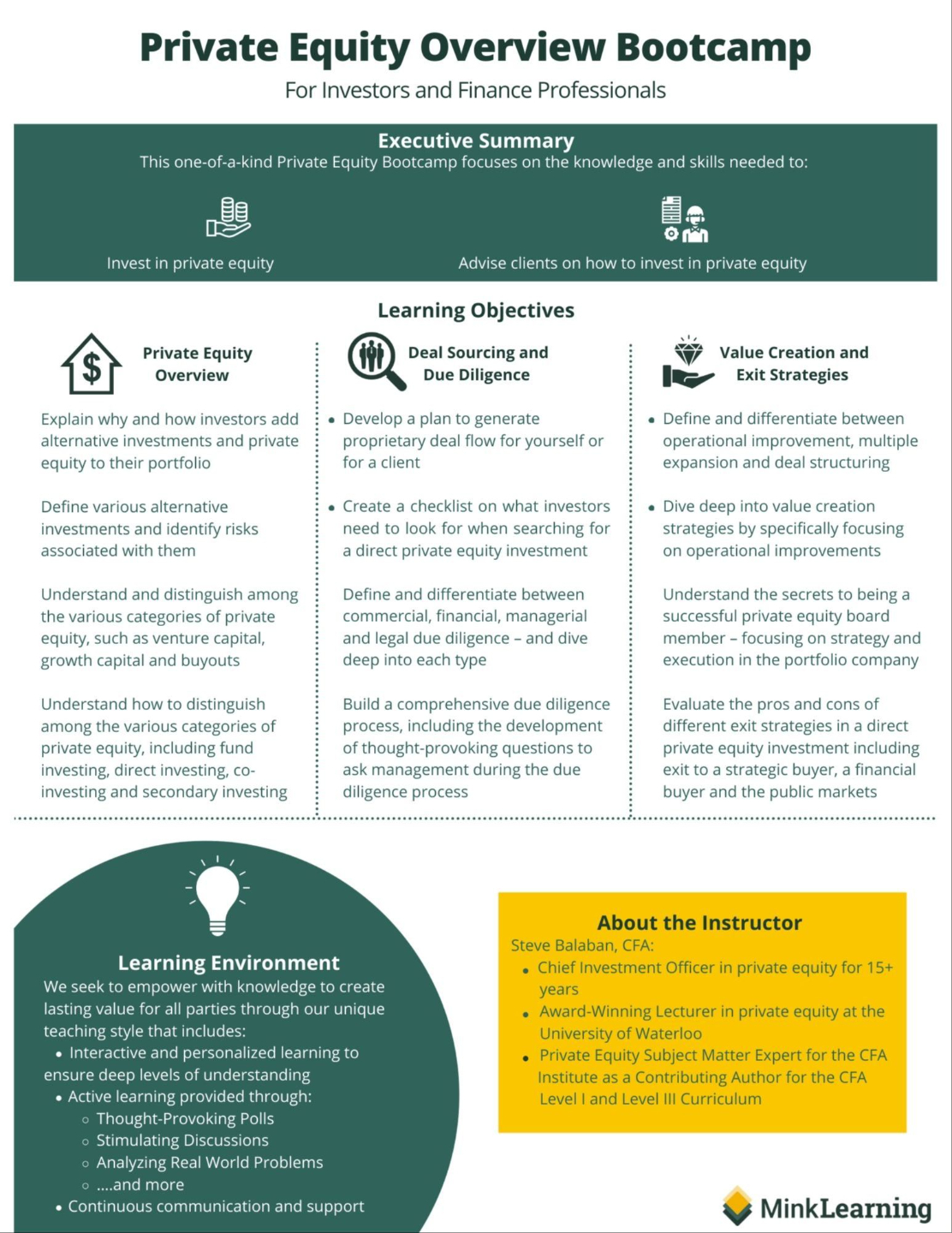 This one-of-a-kind bootcamp is designed for investors and finance professionals and focuses on the knowledge and skills needed to invest in private equity and advise clients on how to invest in private equity.